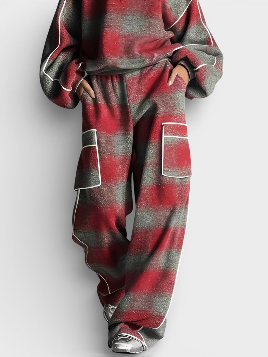 El Adela™ es un conjunto de dos piezas que ofrece la máxima comodidad con un toque moderno y audaz. Su diseño con estampado a cuadros en rojo y gris, combinado con detalles desgastados y ribetes contrastantes, lo convierte en una opción perfecta para quienes buscan un estilo urbano y relajado.
