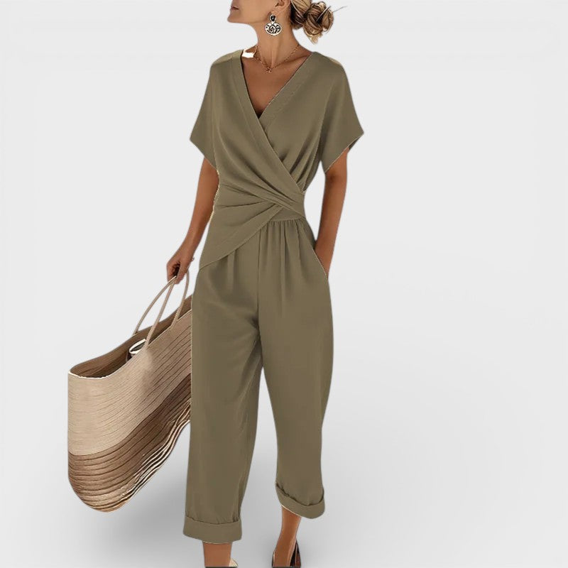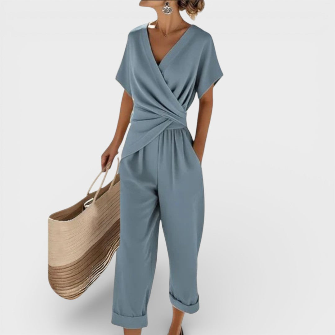 Ivana™ El conjunto elegante de dos piezas es perfecto para mujeres que desean combinar un aspecto sofisticado con la comodidad diaria. La parte superior con un diseño envolvente resalta la cintura, mientras que los pantalones cortos ajustados ofrecen libertad de movimiento y una silueta moderna. La tela ligera y transpirable lo convierte en la opción ideal para los días de verano, paseos junto al mar o salidas casuales elegantes.