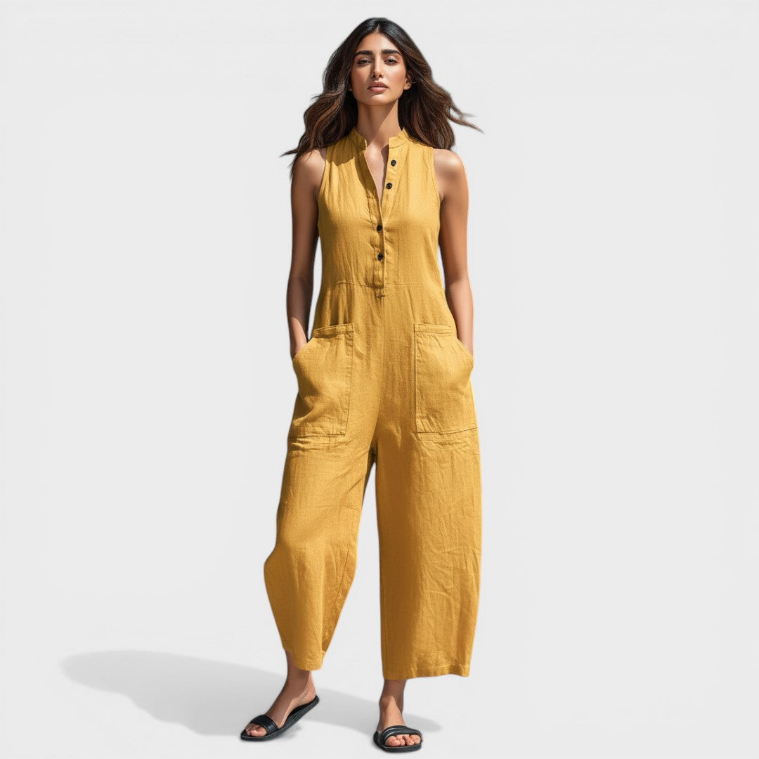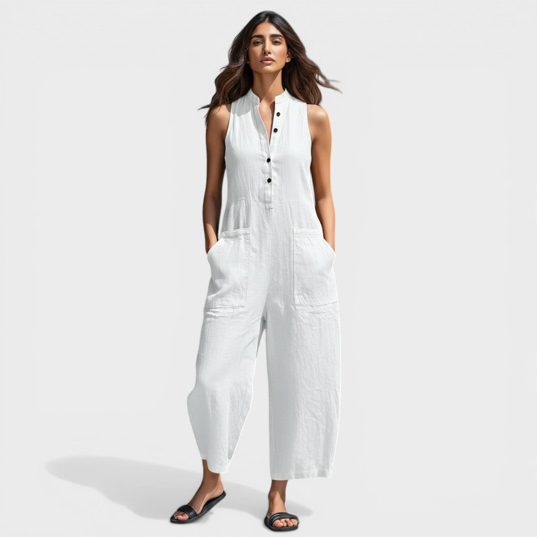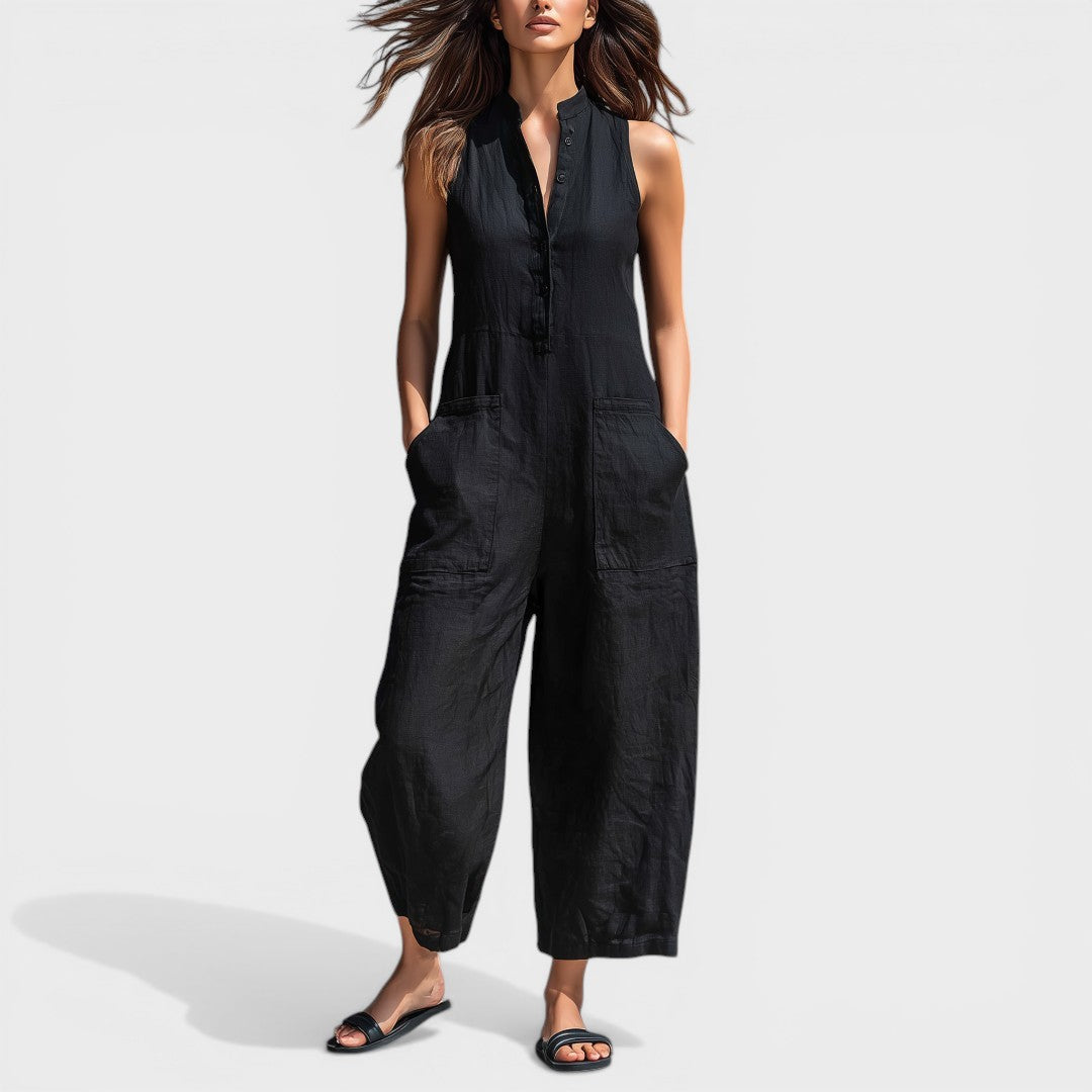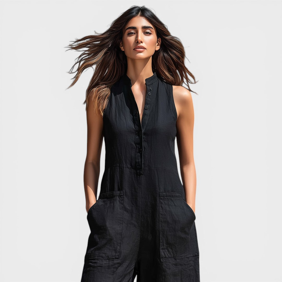 La Lucinda™ es un mono sin mangas con cuello mandarín refinado, cierre frontal de botones y una silueta relajada que fluye con naturalidad. Ligera, transpirable y versátil — perfecta para vacaciones, viajes, salidas informales o cualquier ocasión en que quieras un look pulido sin complicaciones.