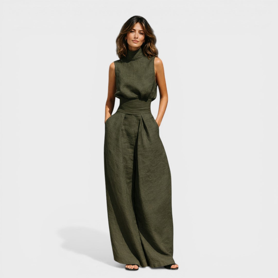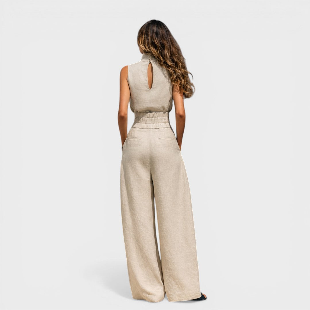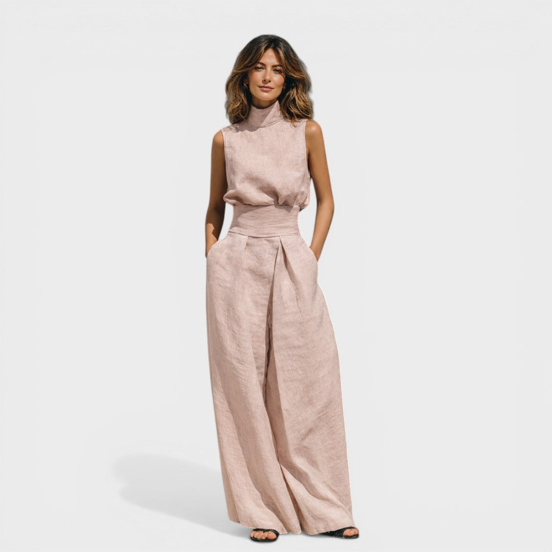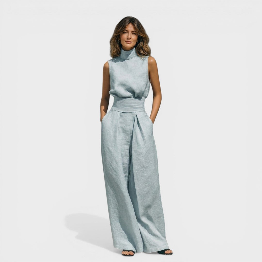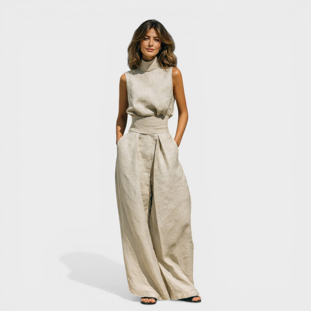 La María™ es un conjunto de dos piezas en mezcla de algodón y lino transpirable — top sin mangas de cuello alto y pantalones de pierna larga — con un diseño minimalista y sólido pensado para la primavera y el verano. Ligero, versátil y fácil de llevar, de días informales a salidas más refinadas.