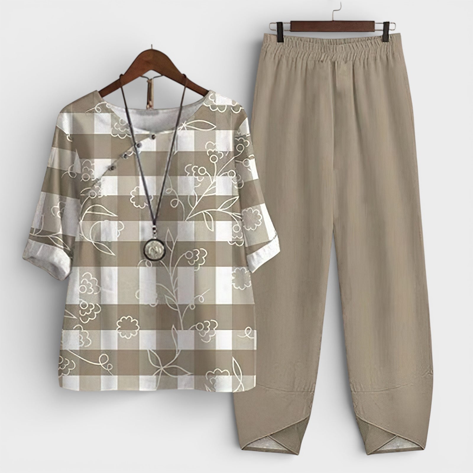 ✔︎ Diseño artesanal chic – Blusa suelta y pantalón entallado para un look elegante y relajado.