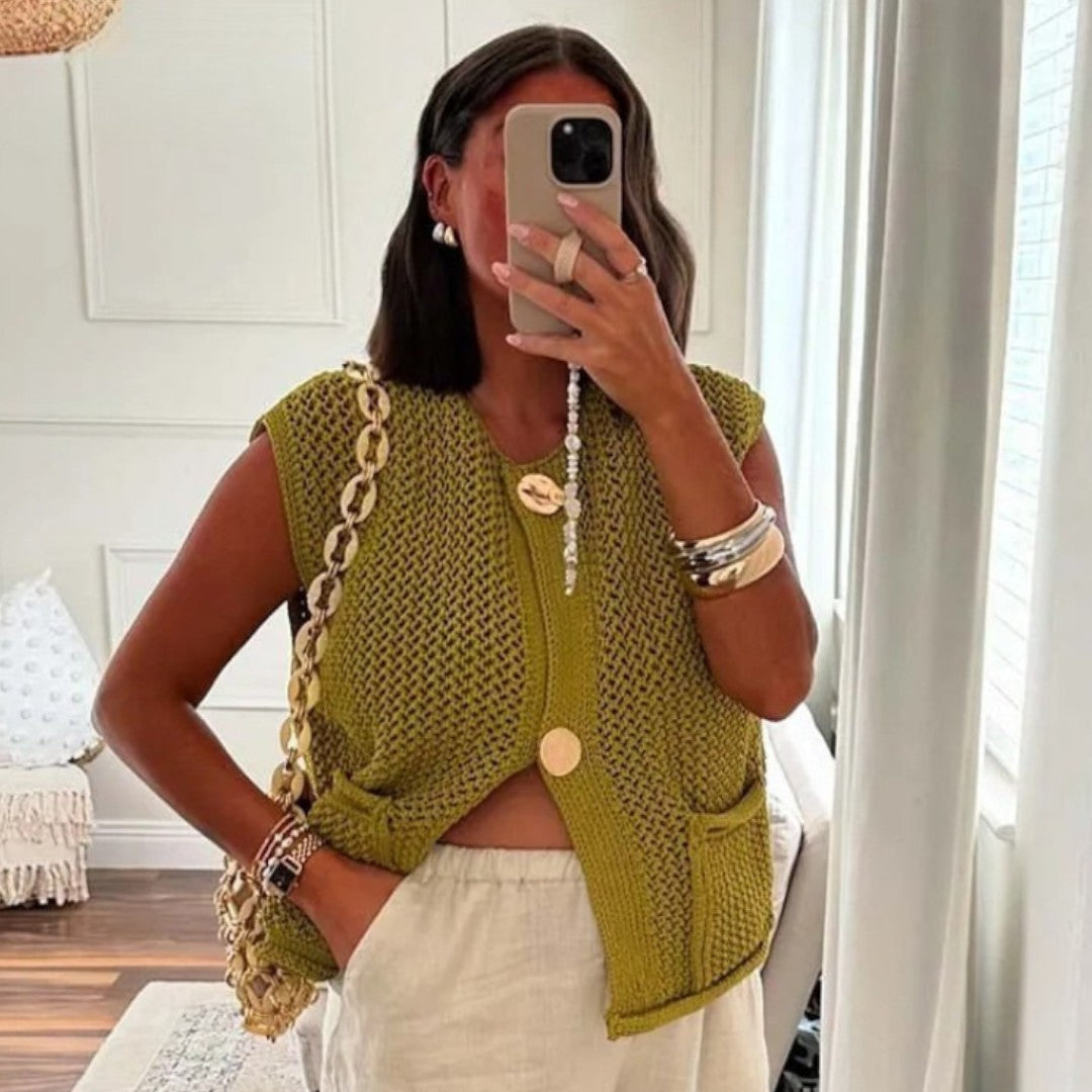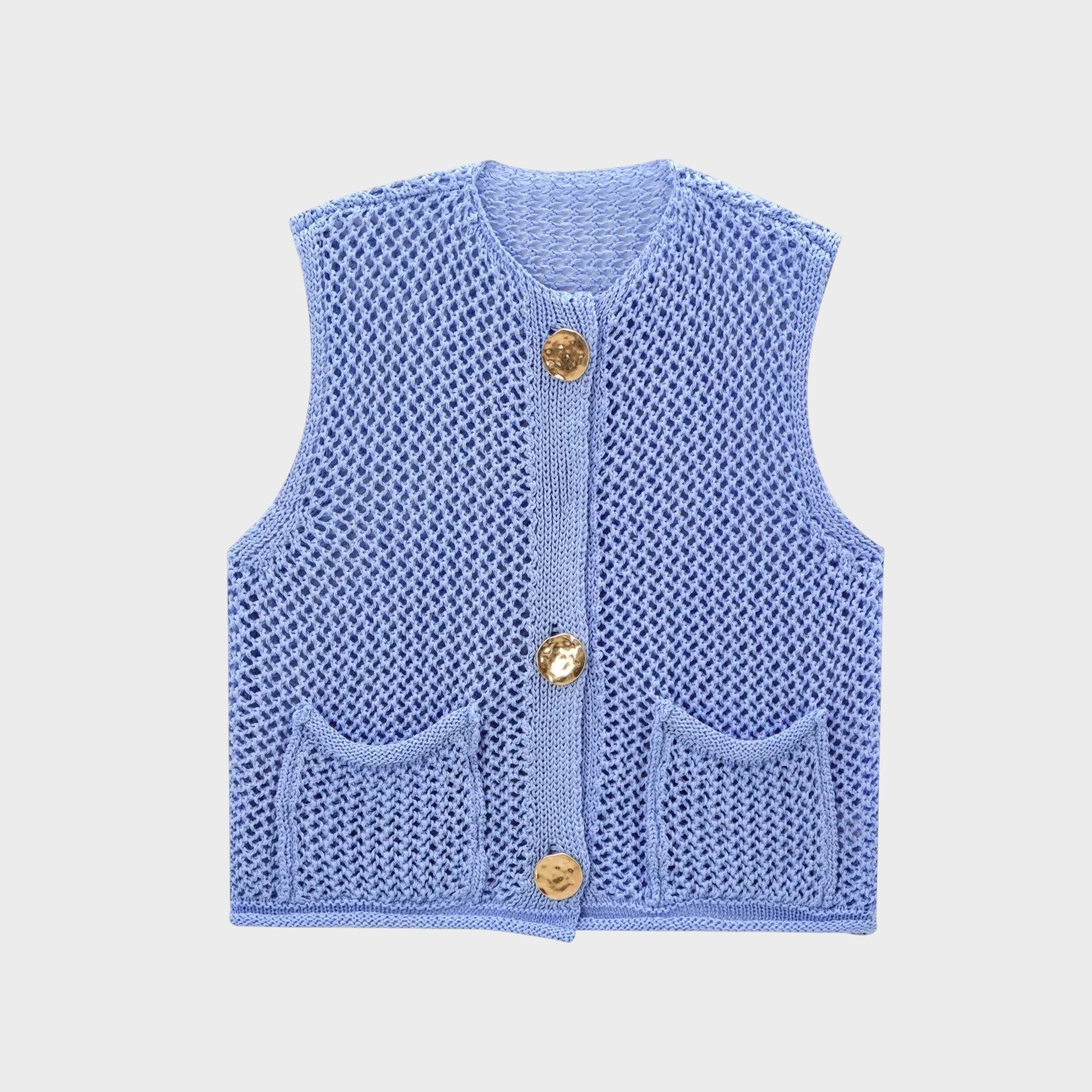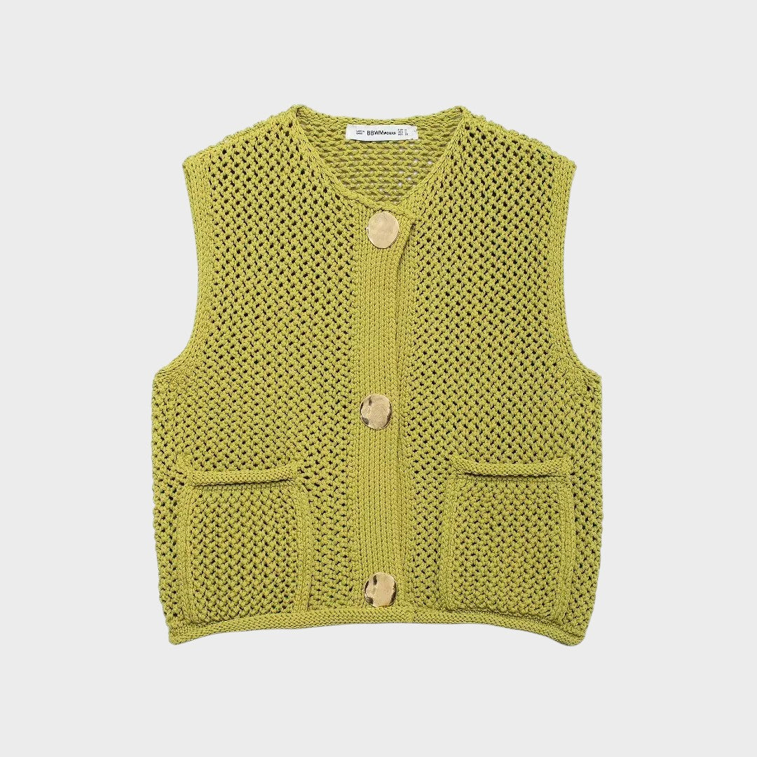Un chaleco de punto atemporal que combina con elegancia comodidad y sofisticación Confeccionado en punto texturizado transpirable, con botones dorados y prácticos bolsillos delanteros, este chaleco fusiona sin esfuerzo la elegancia clásica con la versatilidad moderna.