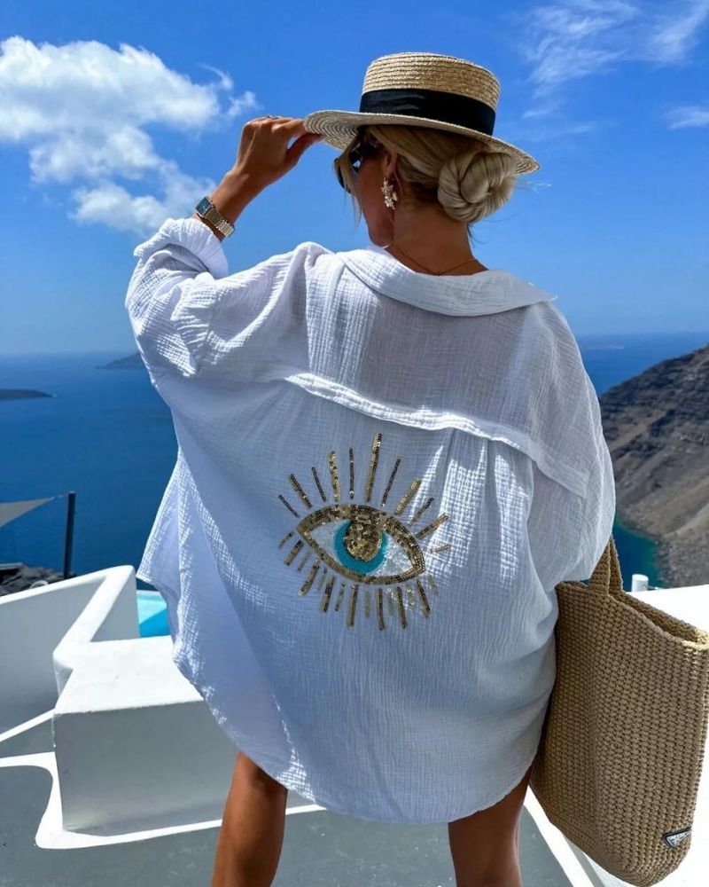 A perfect blend of elegance and casual chic. This shirt features an oversized fit with an eye-catching sequin and bead design on the back, depicting a radiant eye motif.
