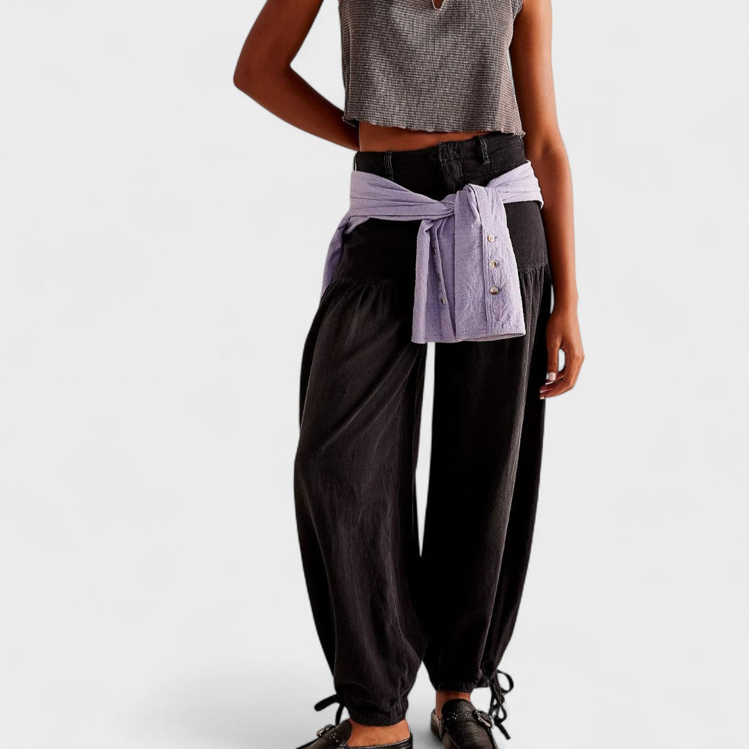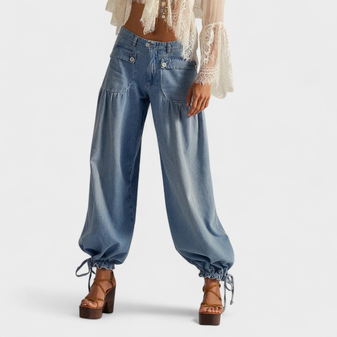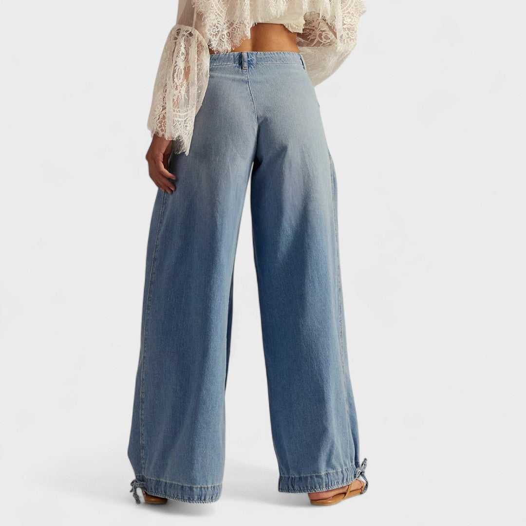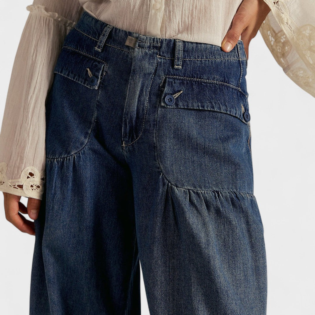 Los vaqueros Raquel™ están confeccionados en denim de algodón transpirable con un corte suelto y fluido que aporta frescura y comodidad a tu día a día. Con detalles de pliegues en los bolsillos dobles y una silueta de pernera ancha, ofrecen un look único, chic y lleno de carácter bohemio.