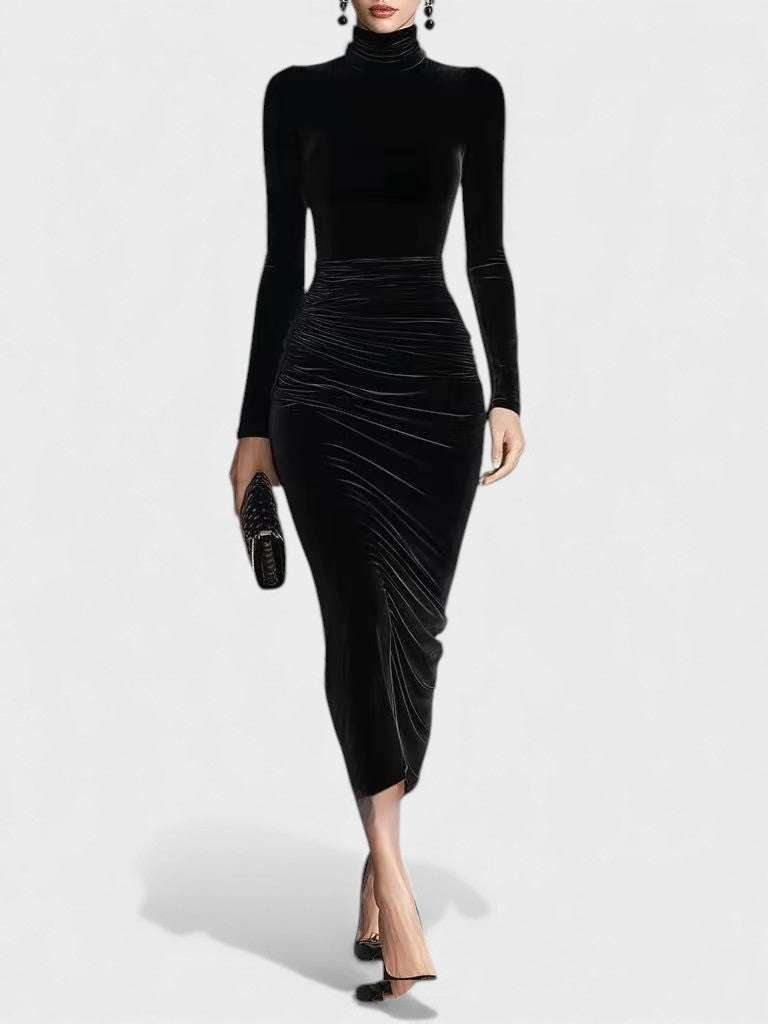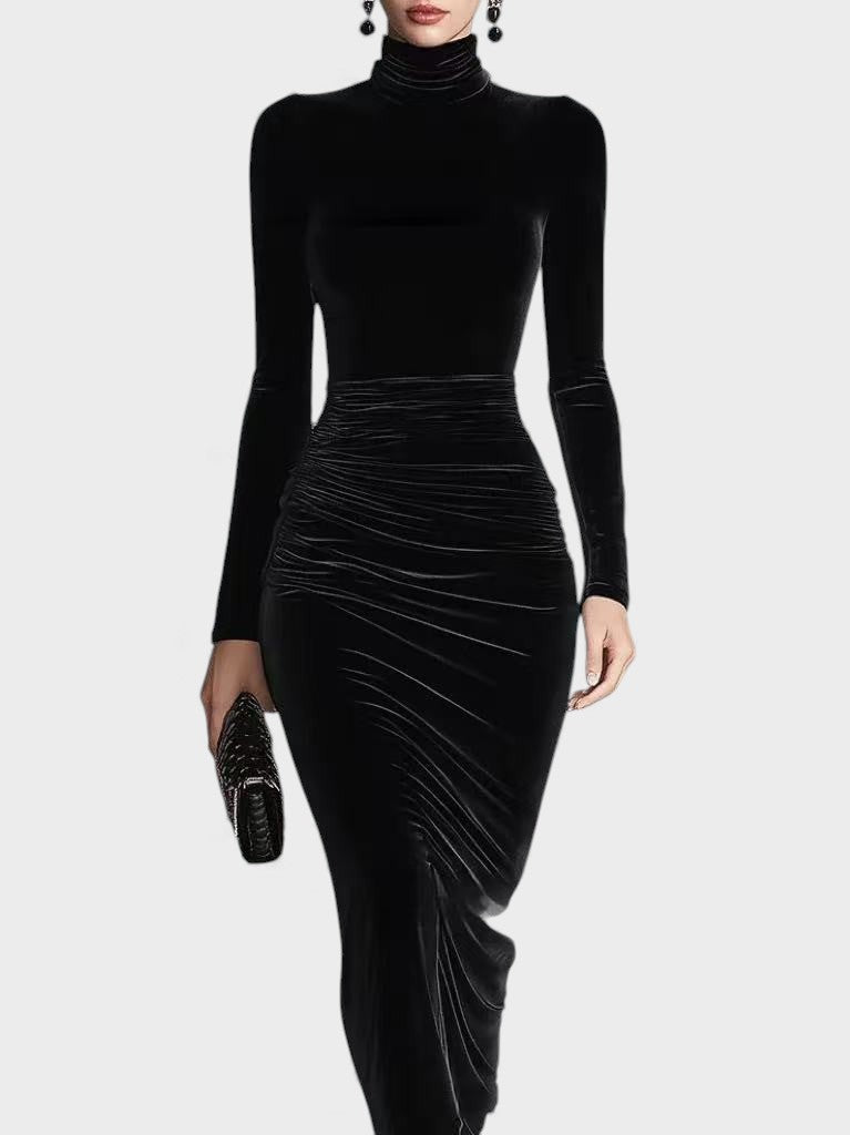 El vestido Salma™ resalta la elegancia con su diseño ajustado en lujoso terciopelo negro. Su corte favorecedor y cuello alto aportan sofisticación, mientras que los detalles fruncidos en la cintura y caderas esculpen la figura, creando una silueta alargada y cautivadora.